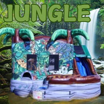 About: Our combo twists give you multiple options! They come with a jumping area, basketball hoop, a curved slide, a built in sprinkler hose, and a pool to land in!